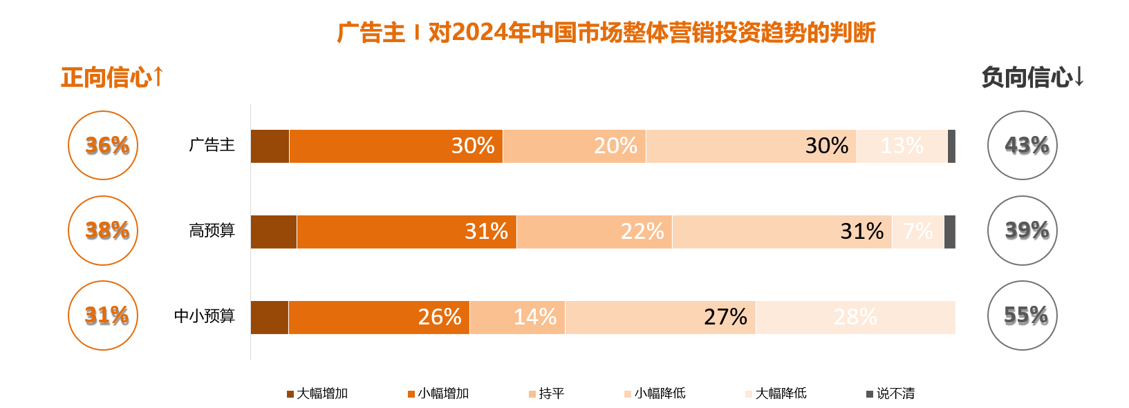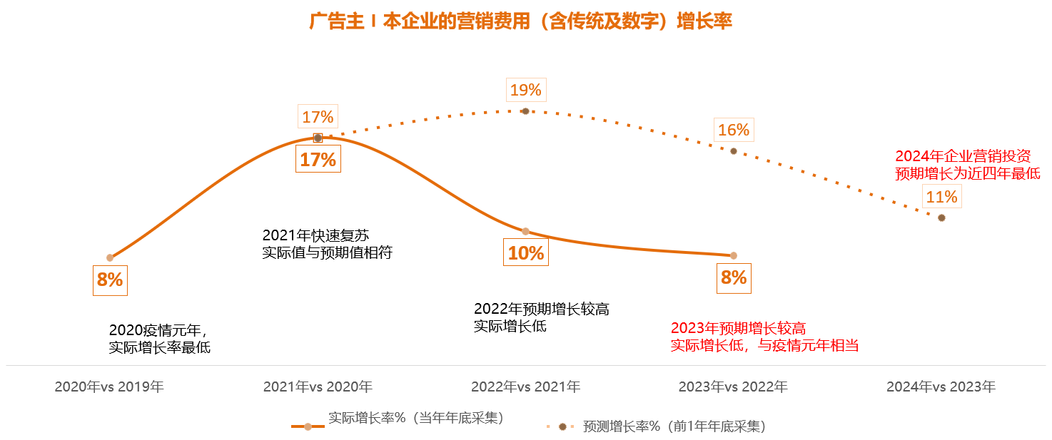 2024中国数字营销趋势(一)行业背景发表时间:2024-01-04 18:00 ![]() 在数字化浪潮的推动下,中国的商业生态正在经历着前所未有的巨变,数字营销更是在这场变革中崭露头角。 2024年,数字营销行业将继续呈现出蓬勃发展的态势,成为企业获取市场份额和塑造品牌形象的关键之地。随着科技不断演进,社会与消费者行为日新月异,我们正迎来一系列令人激动的数字营销趋势。 ![]() 本文将深入剖析这些趋势的核心,为您呈现2024年中国数字营销的全貌,助您在竞争激烈的市场中把握先机。让我们一同探索这个数字化时代的新篇章,揭示未来数字营销的无限可能。 外部经济环境趋势:进入稳定增长周期 经济进入稳定增长周期,消费者信心指数自2022年4月大幅下跌之后,复苏缓慢。 ![]() ![]() 营销行业投资趋势:整体信心下降 信心一般,43%被访者认为明年整体投入会下降,36%认为会上升。中小预算广告主的判断更加负向(超一半认为会下降)。 ![]() 企业营销投资趋势:实际与预期继续下滑 2023年的实际增长与2020年疫情元年相当,2024年的预期增长率为近4年最低。 ![]() 社媒营销投资变化:预期增长也在放缓 社交媒体营销投入预期增长放缓,但13%的增长预期,仍高出整体增长预期(11%)2个百分点。 ![]() 如何应对营销预算的下降? 如果营销预算出现下降,被认可的主流应对之策是提效和创新。减少投放,增加代理压力,优化部门等无奈之举的认可度低。 ![]() 如何应对市场增速放慢和预算紧缩? 逆周期品牌投资 经济不好时,更多的人会选择提升自己,进行自我投资。 当下因为销量走低,用于效果的投资可能会下降,品牌投资因为会带来长期效益而会增长。虽然品牌投资并不一定会有绝对的收益, 但它有机会带来收益,因为一旦形势变坏,其他品牌可能会停止投资,而有实力的企业则有机会通过投资品牌来增强自身的影响力。 精细化运营 许多商家以前采取粗放的经营方式,认为只要能盈利就行,但流量越来越贵, 盈利越来越难,精细化运营的需求由此 产生。 比如,很多消费者把商品加到购物车后却忘记购买,隔天给它们发送一封提醒邮件,并附上优惠券,就很可能带来购买。这种方式虽然看起来简单,但对客户的生意增长贡献较大。 引入数字员工 不管是品牌还是代理,内部都面临较大的工作压力,我们正在探讨如何利用人工智能提升和改变我们的工作流程。在现有人员情况下,提高效率的方法之一是引进数字员工。 比如我的团队中就有两个数字员工,在公司层面也有两个,数字员工可以逐渐完成一些基本工作。其他人员可以专注于其他任务,甚至一定程度上可能不需要这些人员。 (未完待续……) ![]() 推荐阅读 关注“博盈品牌出海”,回复数字111,查看最新报告解读集结 1. 数字化时代的品牌营销--重读品牌(一) 2. 数字化时代的品牌营销--重读品牌(二) 3. “洽”逢其时,辽宁博盈科技走进西部、洽谈未来 4. 2023海外市场,品牌如何更好地与网红合作?八大特征、六大趋势一网打尽! 5. 东软云科技助力中国企业在印尼开拓市场!东南亚交付中心新项目成功上线! 6. 更多资讯…… | 博盈品牌出海 | 与海外网红合作,让全球用户为您代言 / ![]() / 微信号|博盈品牌出海 抖音号|vBlooming |